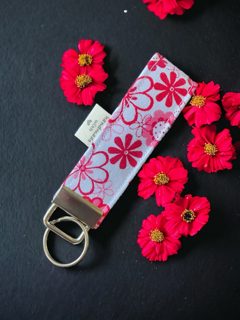 Llavero de tela con flores rojas, hecho a mano. Es un accesorio encantador y único para adornar tus llaves. Este llavero estaría confeccionado con tela suave y resistente.